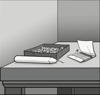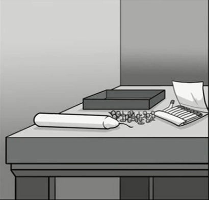 テーブルの上にマッチ、箱に入った画鋲、ロウソクが置かれています。